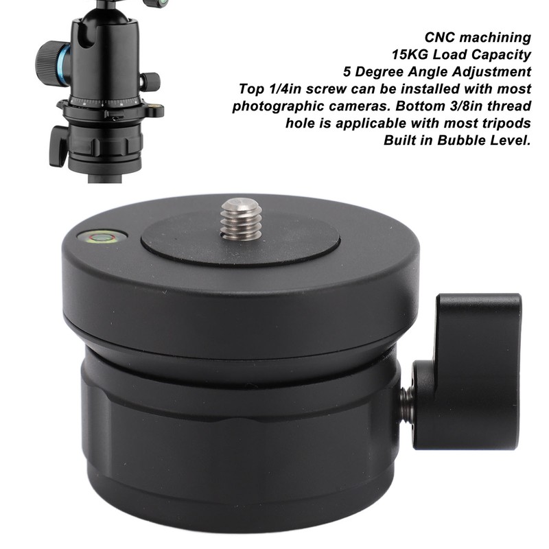 1、Horizontal Adjustment: The leveling base is particularly useful when shooting videos, panoramas, or multiple panorama images. It can tilt in any direction up to 5 degree, helping you find the perfect horizontal position. 2、Easy to Use: Simply place it between the tripod and the ball head, allowing you to level your camera without the need to readjust the tripod legs. It's convenient for your shooting needs. 3、Sturdy and Durable: Made from aerospace grade aluminum alloy material and CNC integrated molding process, tripod leveling base can support a maximum weight of 15KG and has strong anticorrosive ability. 4、Assisted Leveling: The bubble level helps ensure that your base stays level with the horizon. When the bubble is centered, it indicates a level position with the horizon. 5、Quick Fixation: The base is equipped with a 3/8 inch thread at the bottom for easy installation on a tripod. It also has a 1/4 inch screw on the top to mount cameras and quick release plates.