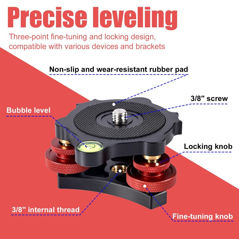 - Exquisite Design: This camera level adopts three point fine-tuning and locking design. It's compatible with various devices and brackets. It can achieve accurate leveling of +/-5 degrees. It's designed 3/8" top screw and 3/8" female thread.