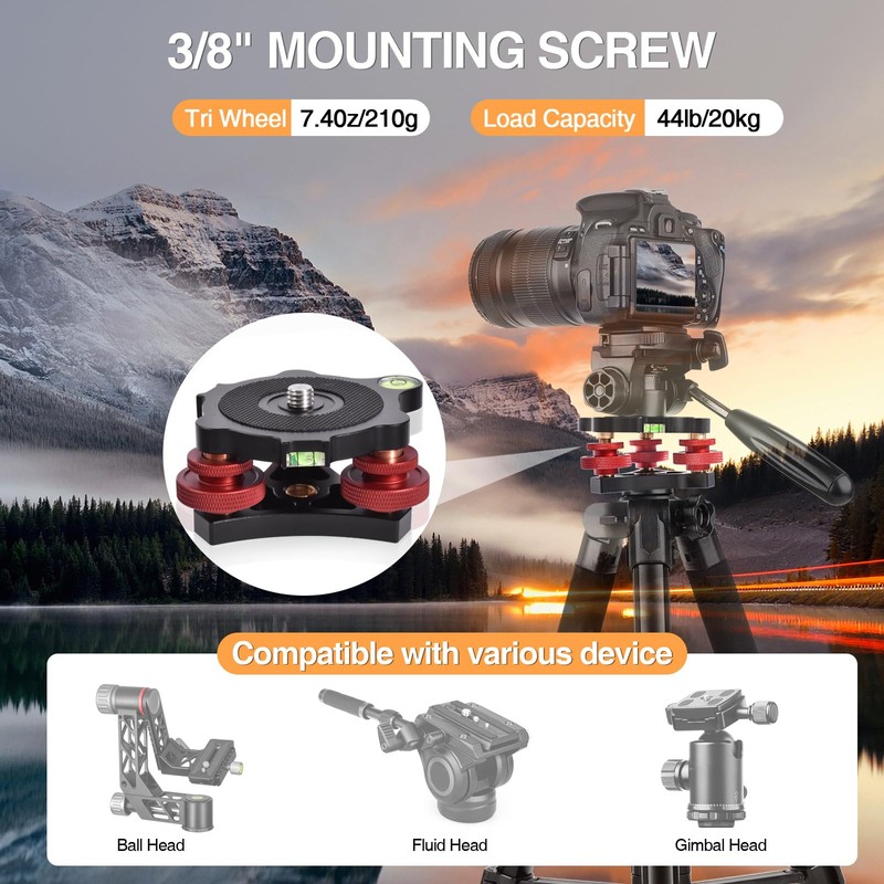 Tripod Leveling Base,Tripod Head Leveling Base Camera Leveler,Tripod Leveler,3/8”Thread,+/-5°Precise Angle Adjustment,Aircraft-Grade Aluminum Alloy 3axis Tri Wheel Head,for Macro Panoramic Head,LP64