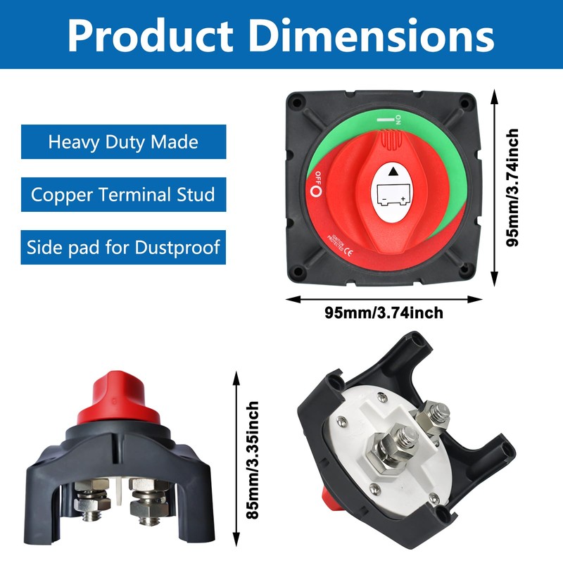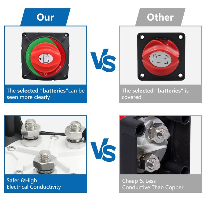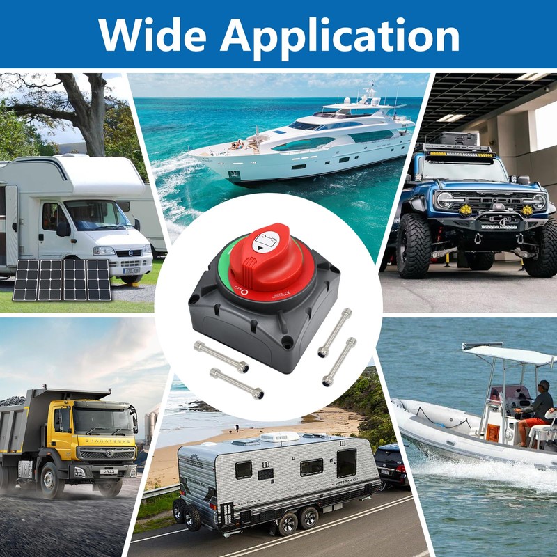 - [Widely Use]: High-quality battery isolation switches are very easy to install, widely used for car, marine boat, RV, camper, travel trailer, truck, ATV, UTV, battery banks and other devices.