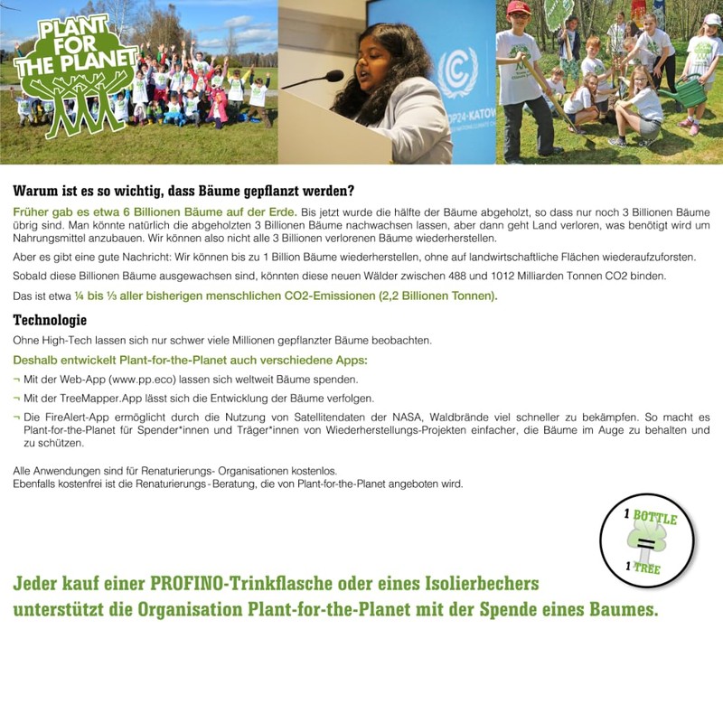 - PLANT FOR THE PLANET: For every purchase of a PROFINO drinking bottle, the Plant-for-the-Planet organisation plants a tree to protect and restore ecosystems worldwide.