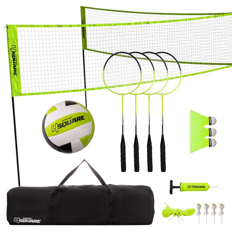 - FIRST EVER FOUR PLAYER COMBO - Take these classic games to the next level of ultimate 4 Square matches. Complete set includes 20’ x 20’ 4 Square net, all poles, one volleyball, one air pump, four steel badminton rackets, three shuttlecocks, boundaries, stakes and one carry case.