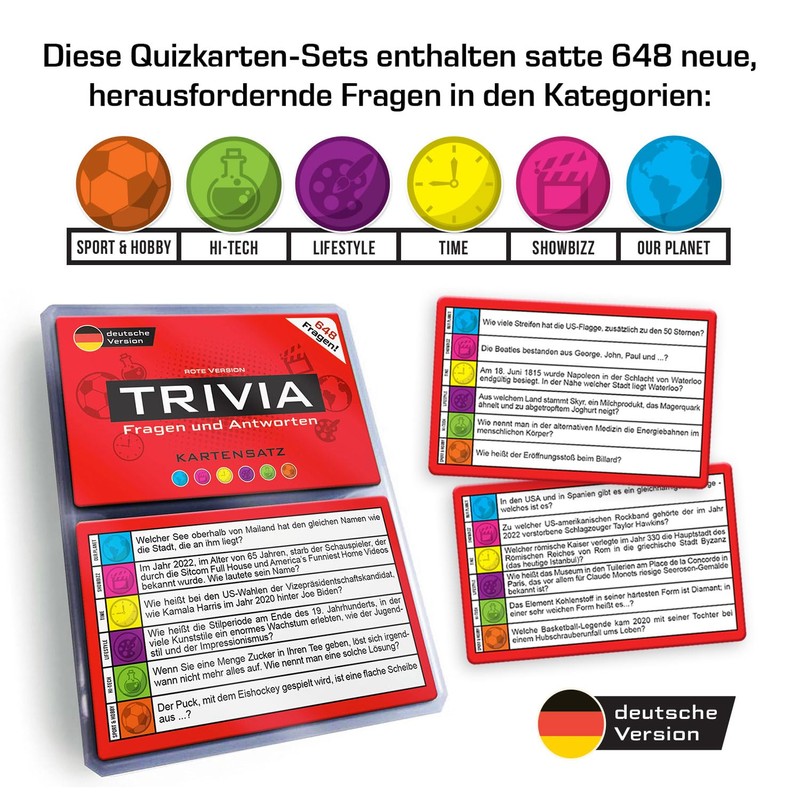 Trivia Card Set, Questions and Answers, Expansion Set, Board Games, Quiz, Pubquiz [German Language] (Red Version)
