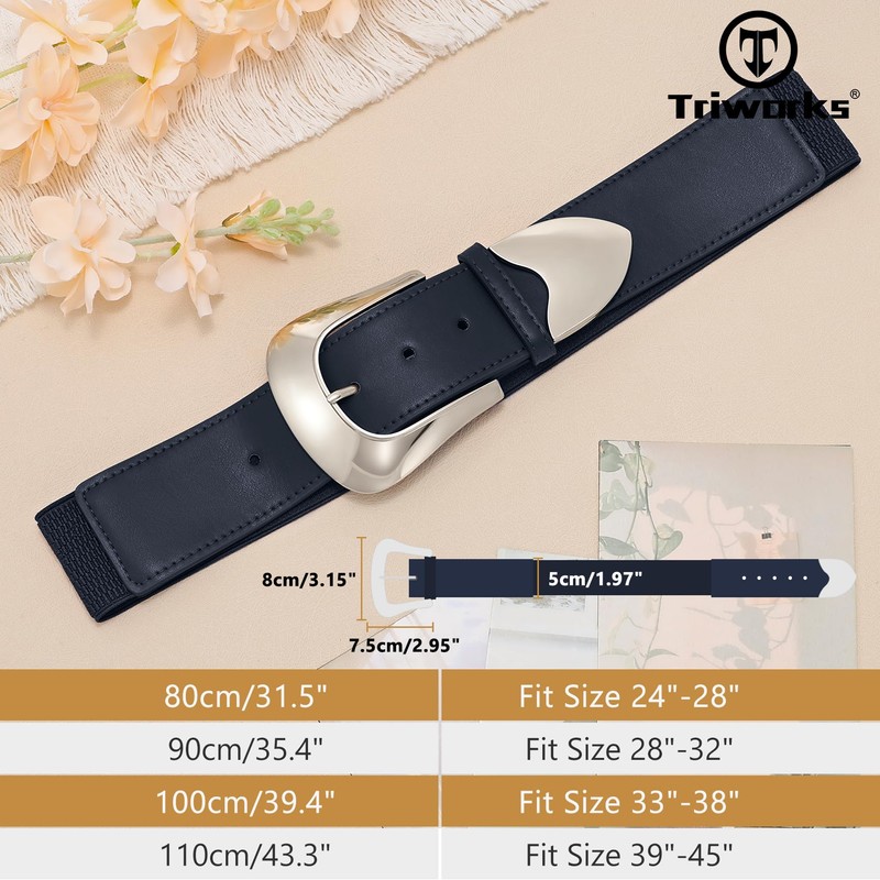 Tamaño ajustable: el ancho del cinturón elástico para mujer es de 5 cm. Cinco agujeros permiten ajustar y la parte posterior es elástica, se puede estirar varias pulgadas de longitud para un gran ajuste. Este ancho cinturón para mujer añade un toque elegante a cualquier atuendo.