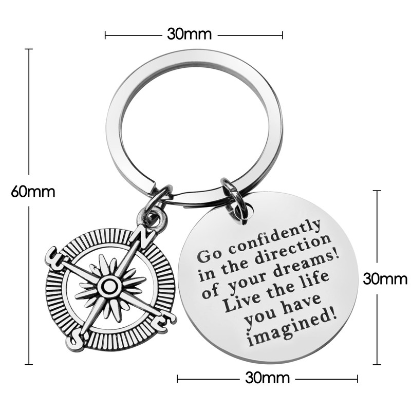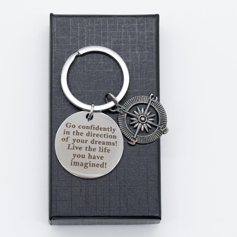 - MOTIVATIONAL DESIGN: The keyring boasts a sleek and stylish design. The phrase "Go Confidently in The Direction of Your Dreams! Live the life you have imagined!" is boldly engraved, creating an ever-present reminder to stay focused on your goals. The compass is a powerful symbol of finding one's way in the world, making it a meaningful and thoughtful gift for someone embarking on a new chapter.