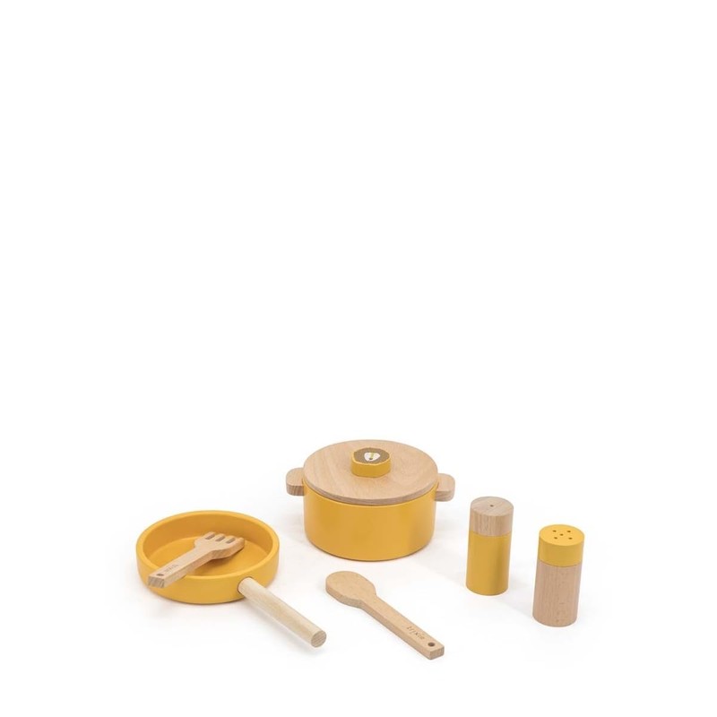 - Set includes pot, pan, salt and pepper shaker, spoon and fork