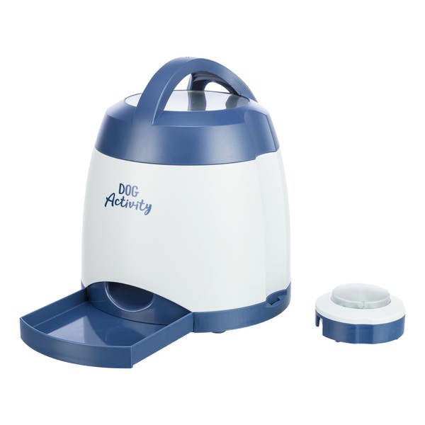- Dog earns reward by pressing the remote release button which triggers the food dispenser