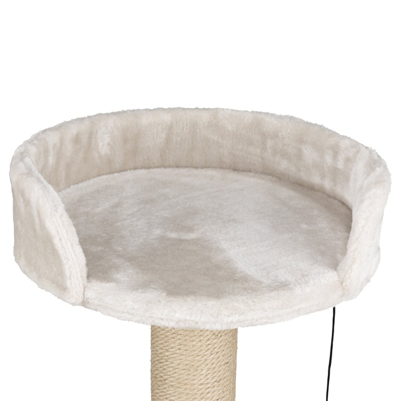 Trixie's mica cat tree is perfect for any feline. The raised platform has a plush backrest for added comfort. There’s even a dangling pom-pom toy for Adventure. Suitable for cats of all ages and activity levels. One year warranty. Materials: mdf, plush, jute.