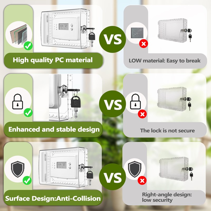 - 【Crystal Clear Durable PC Material】The thermostat lock box crafted from robust and chemically resistant PC plastic. This thermostat cover with lock offers exceptional durability, UV resistance, and anti-yellowing properties. Enjoy a clear view of your thermostat settings at all times