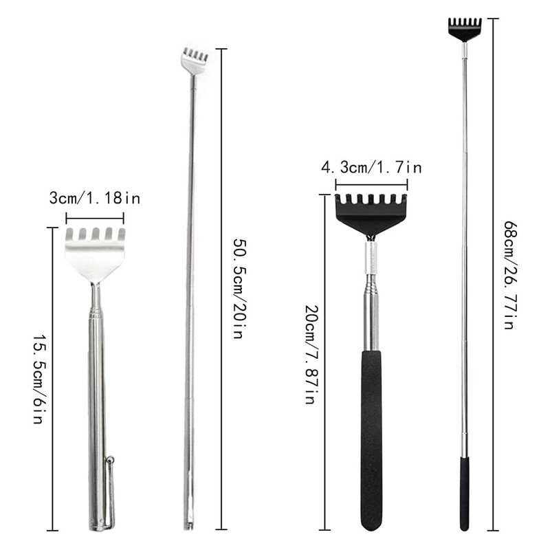 • Retractable&Easy to Adjust: This portable extendable back scratcher with telescopic Handle is more durable than ordinary metal materials! The length of the colored back scratcher is adjustable to 20-68cm/7.87-26.77 inches, and the silver back scratcher can be telescopic from 15.5cm/6 inches to 50.5cm/20 inches, freely adjust the size to meet your itching needs.