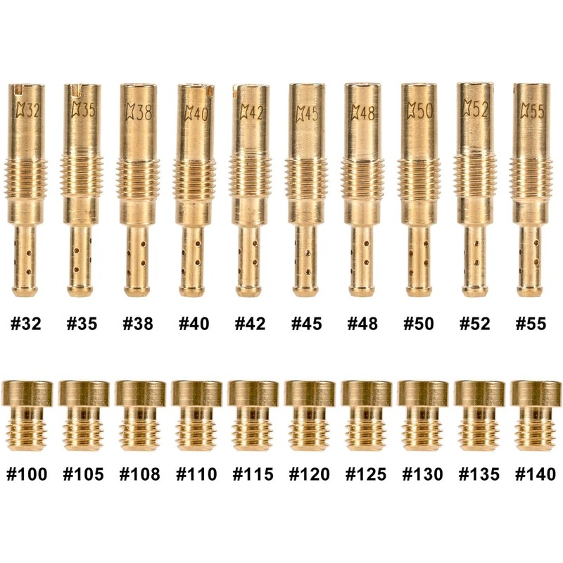- 10 x slow pilot jet, 10 x main jet kit including size: 10 x slow pilot jet: #32 #35 #38 #40 #42 #45 #48 #50 #52 #55; 10 pieces main jet: #100 #105 #108 #110 #115. #120 #125 #130 #135 #140