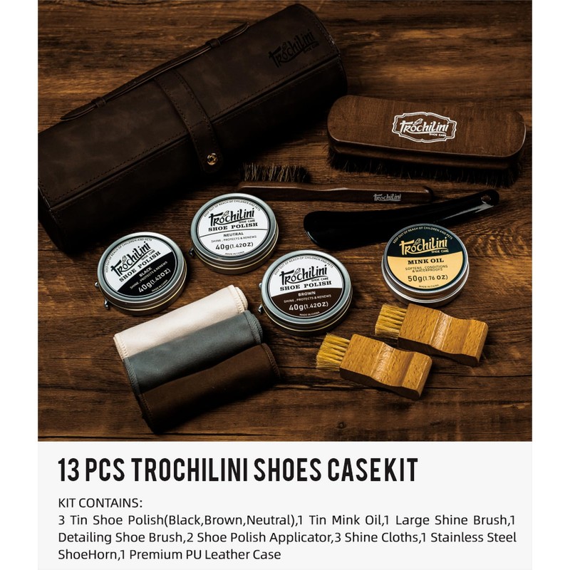 TROCHILINI Shoe Polish 13PC Shoe Shine Kit Leather Boot Care Set Mink Oil Brushes for Gentle Cleaning Care for Men Women Dad Christmas Birthday Gifts