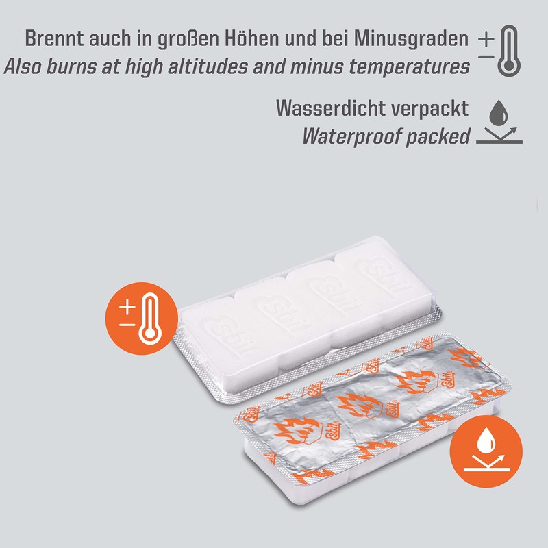 - FÜR UNTERWEGS - Die Würfel sind extrem leicht sowie kompakt und nehmen kaum Platz im Gepäck ein. Bis auf die 4 g-Tabletten sind die Trockenbrennstoff-Größen wasserdicht verpackt.