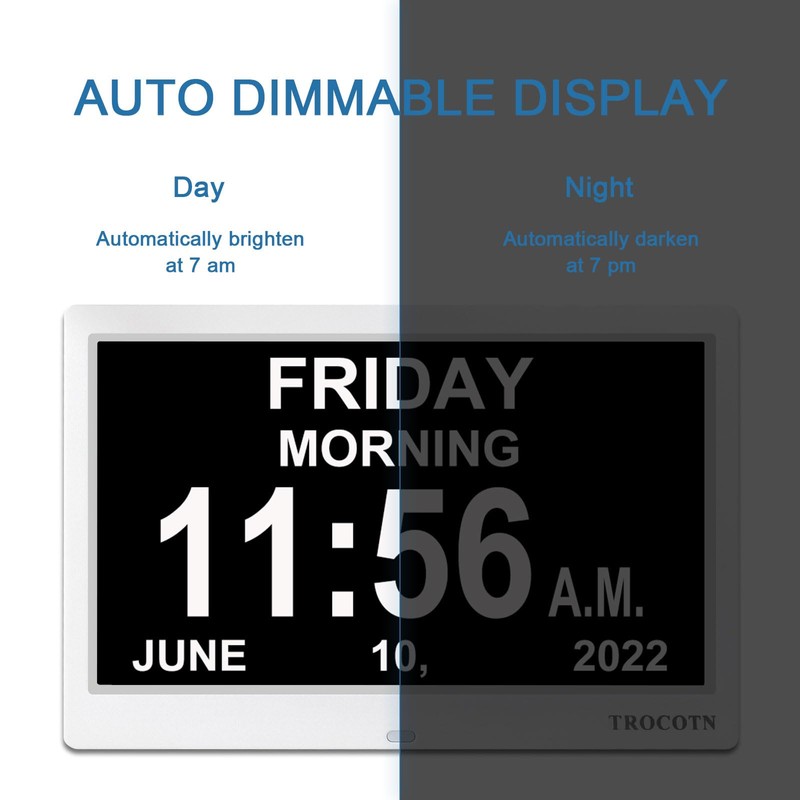 - AUTO DIMMING : The day clock auto dims at 7:00 PM and brightens up at 7:00 AM , great for use in the bedroom.Users can also choose a fixed brightness for use in other locations.