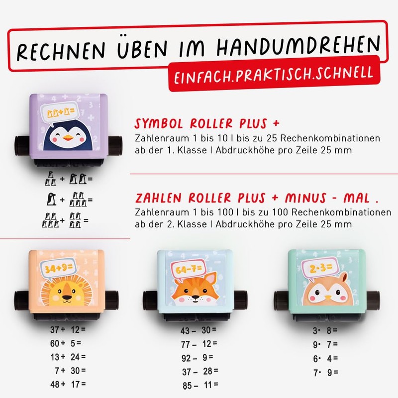 • The calculating rally roll stamp with symbols is an ideal alternative to the well-known calculating slide, the calculation chain or the calculation cube and should not be missing in any school cone at the start of school.