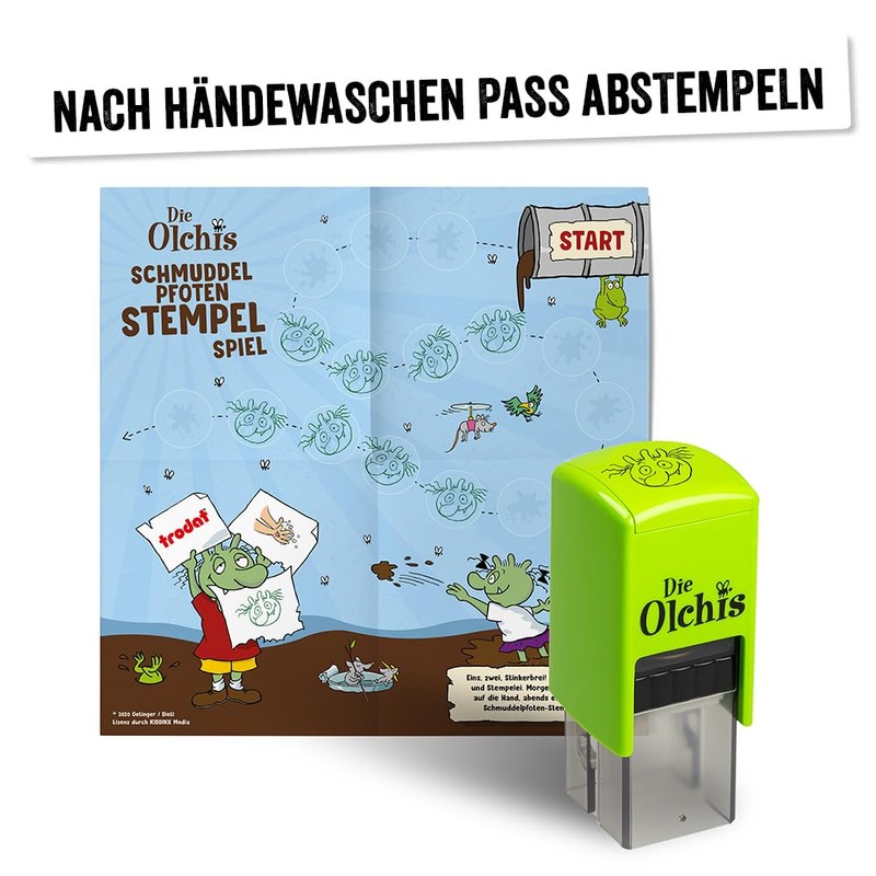 • Motivational stamp for children - stamp motivates children to wash their hands playfully, ideal imprint size for children's hands - 20 x 20 mm, Olchi boy print motif in green