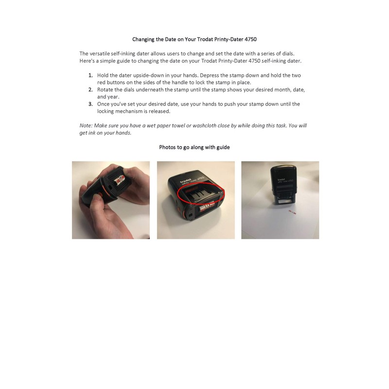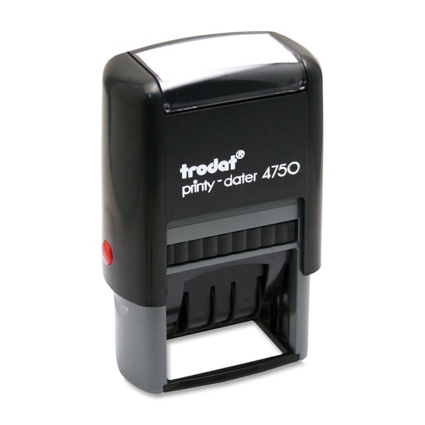 Eco-friendly five-in-one date stamp offers a quick, versatile way to stamp documents with the date only or with the date and four interchangeable key phrases. Self-inking dater delivers rapid, repeat impressions of the words ENTERED, FAXED, PAID or RECEIVED in blue uppercase letters, the date in red and a blue line so you can write in your name. Impression size is 1" x 1-5/8". Four-band date includes months, days and 10 years. The date band cover ensures fingers remain clean. Stamp delivers up to 10,000 impressions and contains a high percentage of recycled material. The frame is made of plastic.