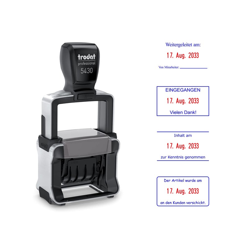 Trodat Professional Date Stamp 5430 - Stamp Personalised with Date and Desired Text, Self-Inking, 2 Lines, 41 x 24 mm, Blue and Red Print