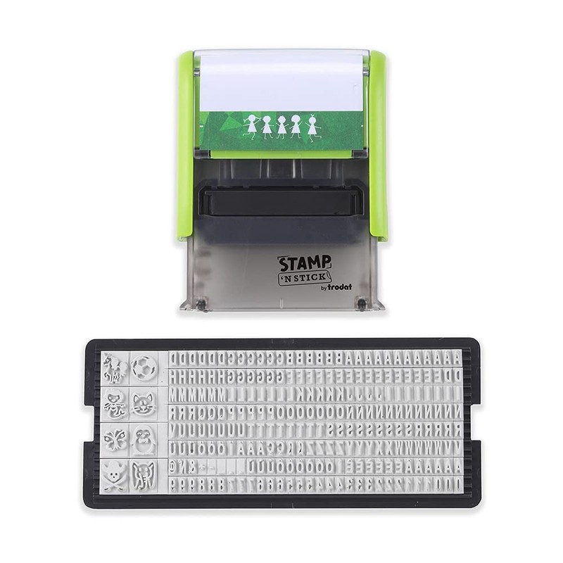 - The Stamp 'N Stick Includes 1 green stamp with black textile ink cartridge, 1 letter and number set with fun icons, 30 durable stickers, 1m iron fleece, 1 set of tweezers