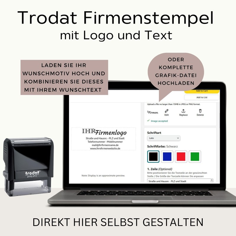 - DIREKT HIER SELBST GESTALTEN: laden Sie rechts oben über "Jetzt anpassen" Ihr Wunschmotiv hoch und kombinieren Sie dieses mit Firmenwortlaut, Name, Adresse, Mobilnummer, Steuernummer, E-Mail uvm. – verschiedene Schriftarten sowie 4 Abdruckfarben stehen zur Verfügung