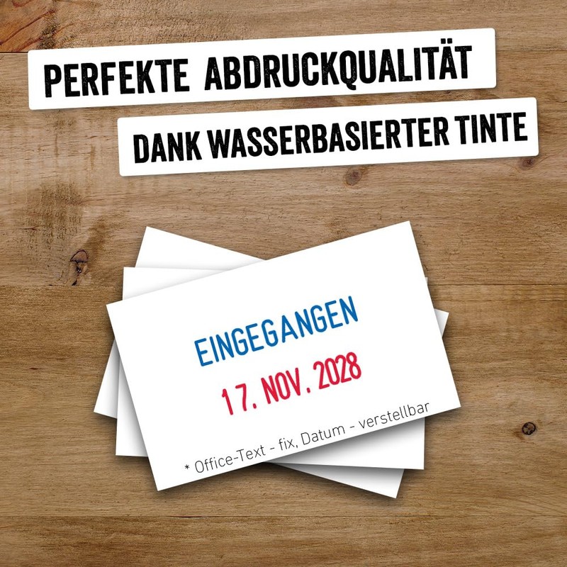 • Lieferumfang des Stempelsets – Stempel in Schwarz, Office-Text und Datum in Deutsch, Stempelkissen blau-rot mit dokumentenechter trodat Stempeltinte auf Wasserbasis – farbintensiver Abdruck garantiert
