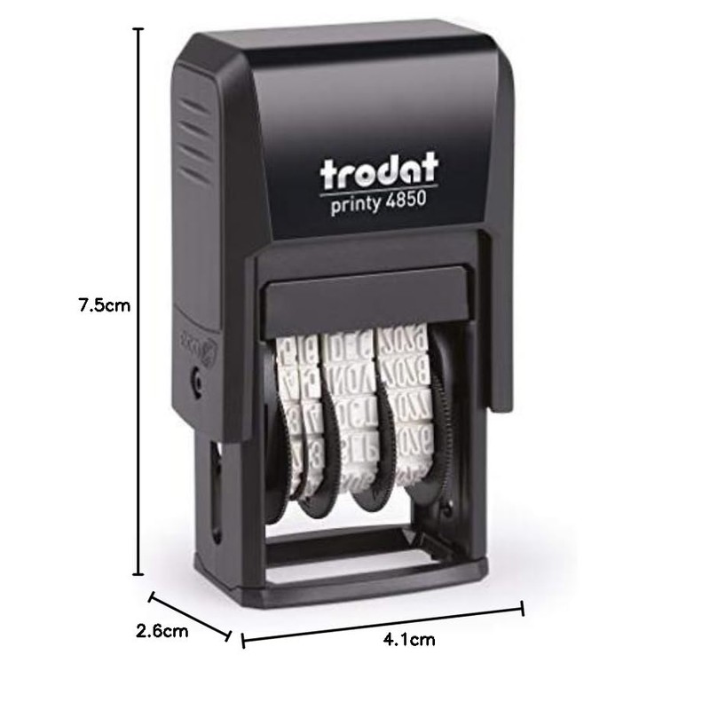 Die Trodat Printy Serie ist die praktische Stempelfamilie fürs Büro, für Praxen, Schulen, Ämter sowie für Zuhause und Unterwegs. Mit dem kleinen Trodat Printy 4850 L1 Dater markieren Sie Ihren eingehenden Schriftverkehr und legen ihn dementsprechend ab oder ordnen ihn damit in Ihre Ordner. Dieser praktische Bürostempel ist viele Jahre und tausende Abdrücke im Einsatz ohne der Notwendigkeit dabei das Kissen zu wechseln. Sollte dennoch das Farbkissen gewechselt werden, so ist das entsprechende Austauschkissen 6/4850/2 jederzeit bestellbar. Die Stempelfarbe ist dokumentenecht nach DIN 14145-2. Das heißt, der Abdruck des Trodat Printys trocknet schnell und bleibt wischfest. Er kann nicht ohne Spuren zu hinterlassen entfernt werden, die Farbe ist lichtecht und verblasst daher nicht. Farben und Zeichnung verlaufen unter Wassereinfluß nur minimalst und sind gegenüber bestimmten Chemikalien beständig. Seit 2013 produziert Trodat mehr als 70 seiner meistverkauften Produkte mit dem technisch höchstmöglichen Anteil an Recyclingkunststoff um ihren CO2-Fußabdruck zu reduzieren. Ein verbleibender, unvermeidbarer CO2-Fußabdruck dieser Produkte wird anschließend durch Investitionen in vom WWF empfohlene Gold Standard Klimaschutzprojekte ausgeglichen. Als Ergebnis bietet Trodat seine meistverkauften Produkte serienmäßig klimaneutral an!.
