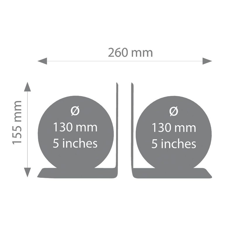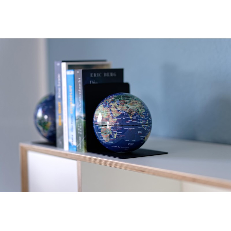 Whether Goethe, Shakespeare or cookbook: between the bookend duo BOOKGLOBE literature classics, guides and other favourite books feel well looked after and appreciated. The 155 mm high and 260 mm wide set consists of two elements, each consisting of a black and silver globe and a black metal bookend. The fixation by a magnet makes it possible to easily remove the globes and view them comfortably.