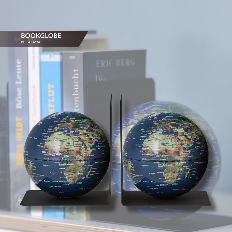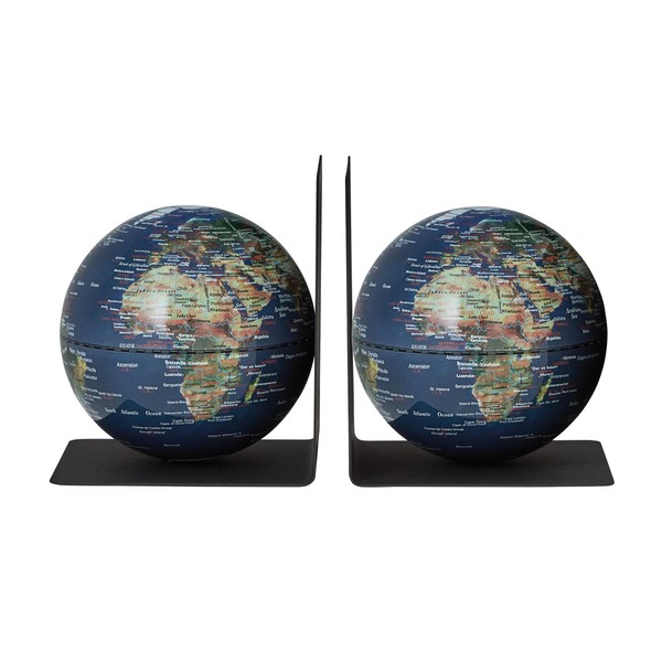 - TROIKA original bookend globe set made of metal. The bookends are made of matt black metal and have a height of 15.5 cm. Two glossy globes with green-brown country areas and blue seas, inscribed in English, with continents, oceans, countries, geographical zones and major cities, deserts and mountains. Placed next to each other, they reach a width of 26 cm with a total weight of 1221 g.