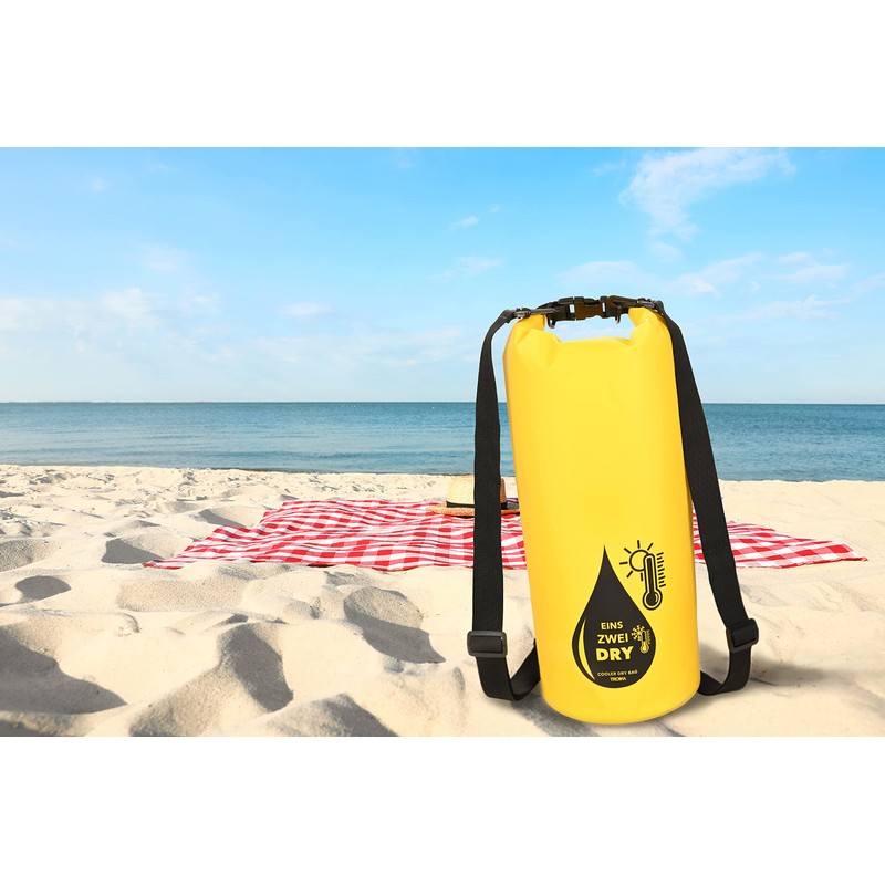 - IPX6 waterproof rating, removable shoulder straps, 10 litre capacity, load capacity up to 10 kg, taped seams, durable material, protects contents from water, thermal lining keeps contents cold for hours