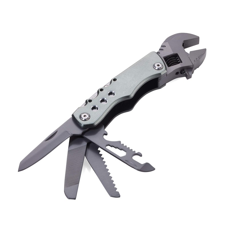 - 12 functions and locking function. Adjustable wrench, knife, saw, file, bottle opener