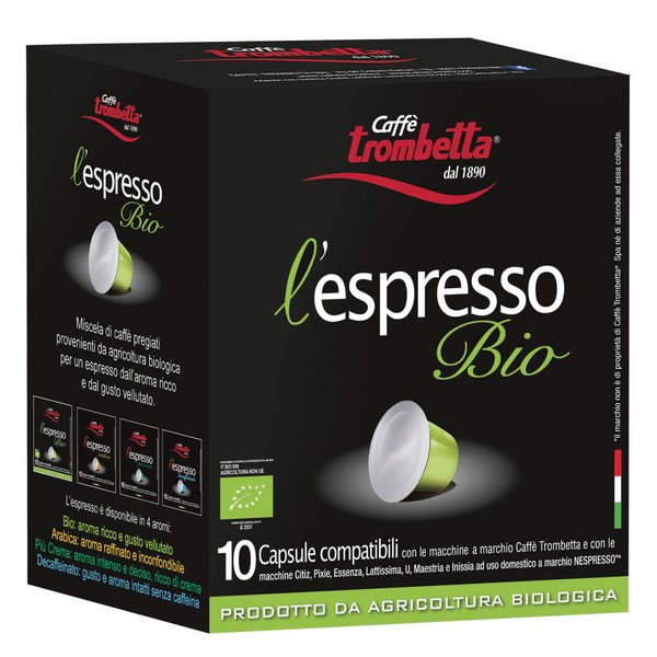 Trombetta Nespresso Organic Italian Coffee - 10 Capsules “L’espresso Bio” Instant Organic Espresso Coffee - Compatible Nespresso Espresso Coffee Pods