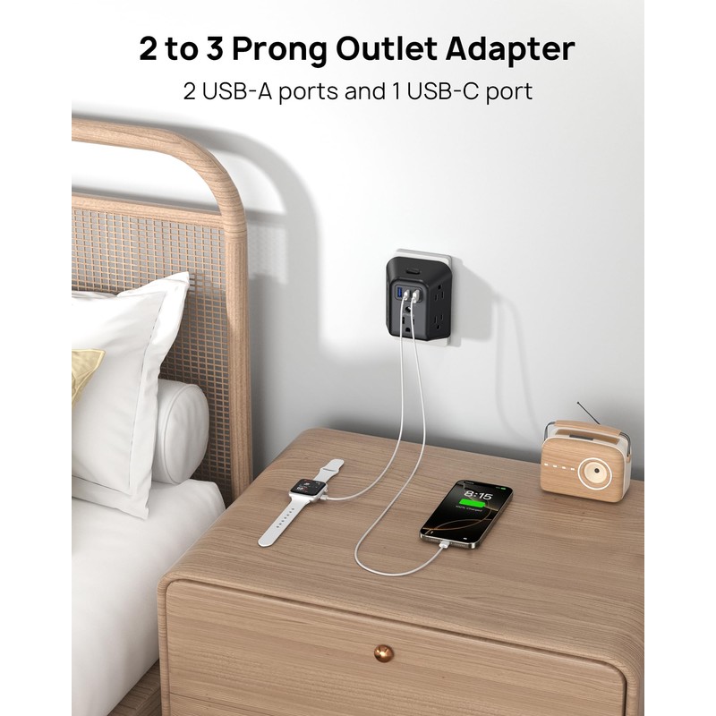 - 2 Prong to 3 Prong Outlet Adapter: The 3 prong to 2 prong adapter that converts a polarized 2 prong outlet to 3 prong outlet, is equipped with 5 AC outlets, 2 USB-A Ports and 1 USB-C Port, which allows you to charge your multiple devices simultaneously, suitable for the bedroom, hotel, kitchen or the non-grounded outlets in older house