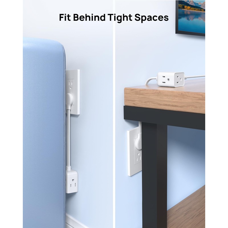 - Perfect for Tight Spaces: Measured at 1.26" depth and with a 0.33” low-profile plug, the flat wall outlet extender can lay flush against the wall. All outlets on 3 sides and no outlet on the front make it perfect for fitting in any tight place like behind dresser, bed frame, couch, kitchen appliances, and decorative objects