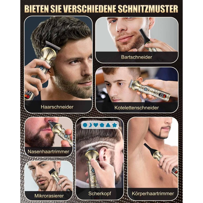 - [7-in-1 Männer-Pflegeset, komplettes Zubehör] Dieses Set enthält T-Klingen-Trimmer mit 4 Aufsätzen (1/3/5/7 mm), Haarschneider mit 5 Aufsätzen (3/6/9/12/15 mm), Präzisions-Trimmer, Mini-Rasierer, Nasenhaartrimmer, Barttrimmer, Körpertrimmer. Reichhaltiges Zubehör: USB-C-Ladekabel, Reinigungsbürste, Schmieröl, Entshaarungsschwamm, Umhangtuch, Aufbewahrungstasche, Haarklammern, Kamm, Styling-Schablone – alles vorhanden, um mühelos verschiedene tägliche Pflegebedürfnisse zu erfüllen.