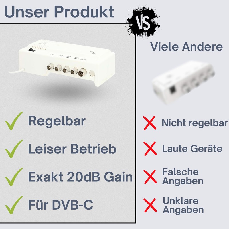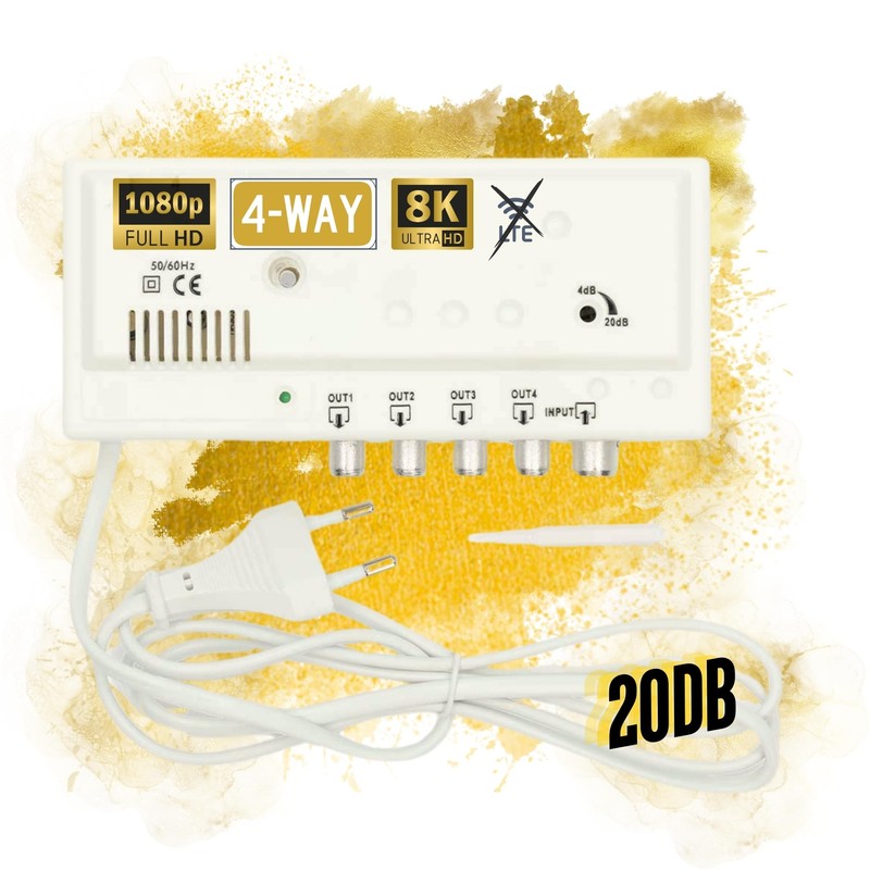 Connect the amplifier with gain control and four outputs to your home connection to distribute your signal to 4 lines without loss. Plug and play LTE filter to reduce the impact on the 800 MHz band through 4G signals.