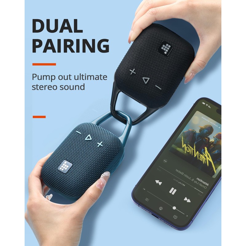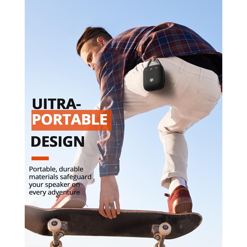 - 【Large Integrated Carabiner & Portable】Designed for portability, the H1 small Bluetooth speaker features a built-in hook for easy carrying. Its compact size (5.39x3.15x1.77 inches) and lightweight design (0.573 lbs) make it an ideal travel companion that won't add bulk to your gear. The large clip ensures secure attachment, perfect for minimal gear travel.
