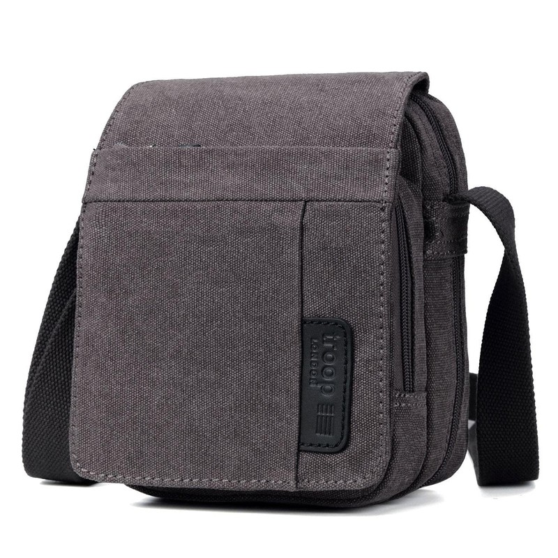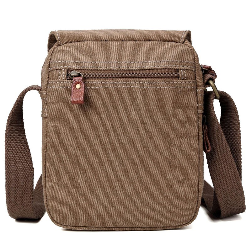 - Exterior features: Adjustable canvas shoulder strap with stylish and functional brass plated buckles. Secure pocket on the back. Zip pocket on the front flap.