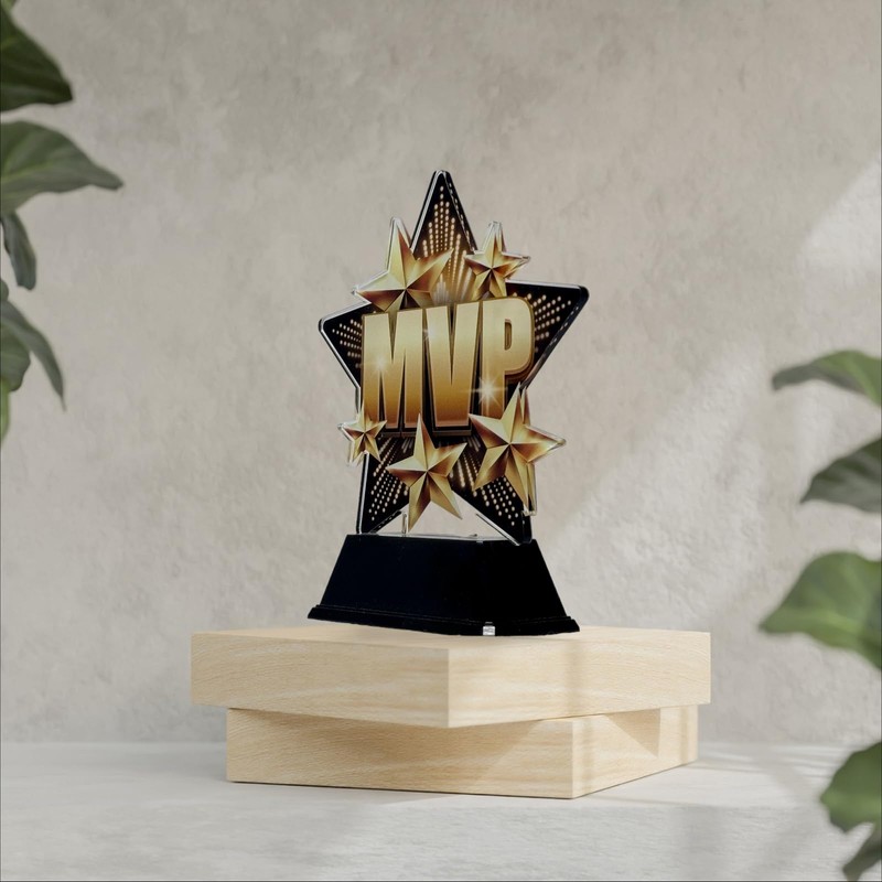 • ✔️ The Trophy Monster MVP Trophy is an exceptional and contemporary award. This trophy showcases a high-quality full-color print on the reverse side of the 5/32" thick acrylic, elegantly mounted on a sturdy black PVC base.