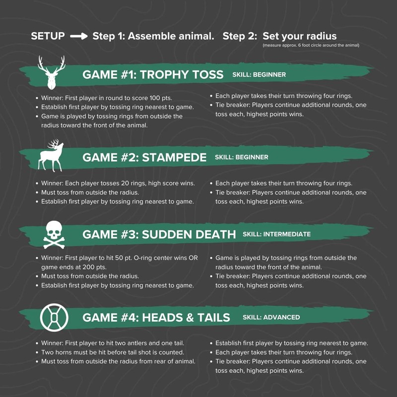 - Exciting Gameplay: Aim, toss, and score! This campsite game reinvents ring toss with rings that have different hole sizes for strategic play. From six feet away, aim for the antlers or tail. The center hole scores 50 points, while the other holes earn 10 or 5 points. Race to 100 points in classic mode or try other game variations!