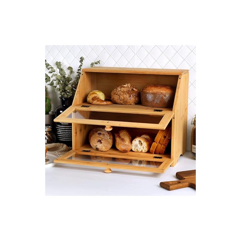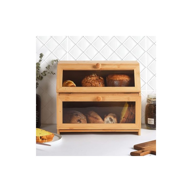 Tropic Home Supplies Double Layer Bread Box for Kitchen Countertop, Large Breadbox Bread with Windows, Food Keeper for Pastries, Bread & Cookies (Natural Bamboo)