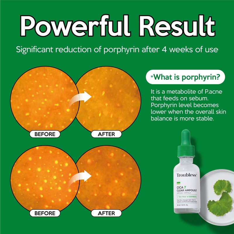 - 🍀Clear Ampoule For Acne-Prone Skin :Made by Instead of a single Cica ingredient, 7 Cica ingredients that have different skin-soothing effects are made with the blend ratio of Troubless only. If you need continuous skin trouble and skin calming care, solve your problems with "Troubless Clear Cica 7 Ampoule."