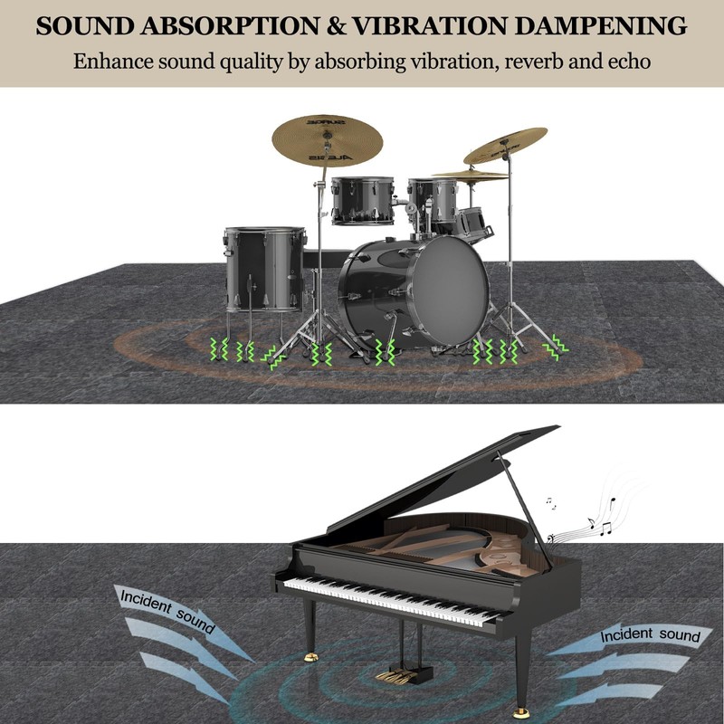 - 【SUPERIOR SOUND ABSORPTION & VIBRATION DAMPENING】: Our thick acoustic floor tiles excel at absorbing sound energy to reduce reverb and echo in the room. Meanwhile, they are also ideal vibration isolation mats for musical instruments such as drums and pianos. NRC(noise reduction coefficient): 0.85. Average absorption coefficient: 0.75