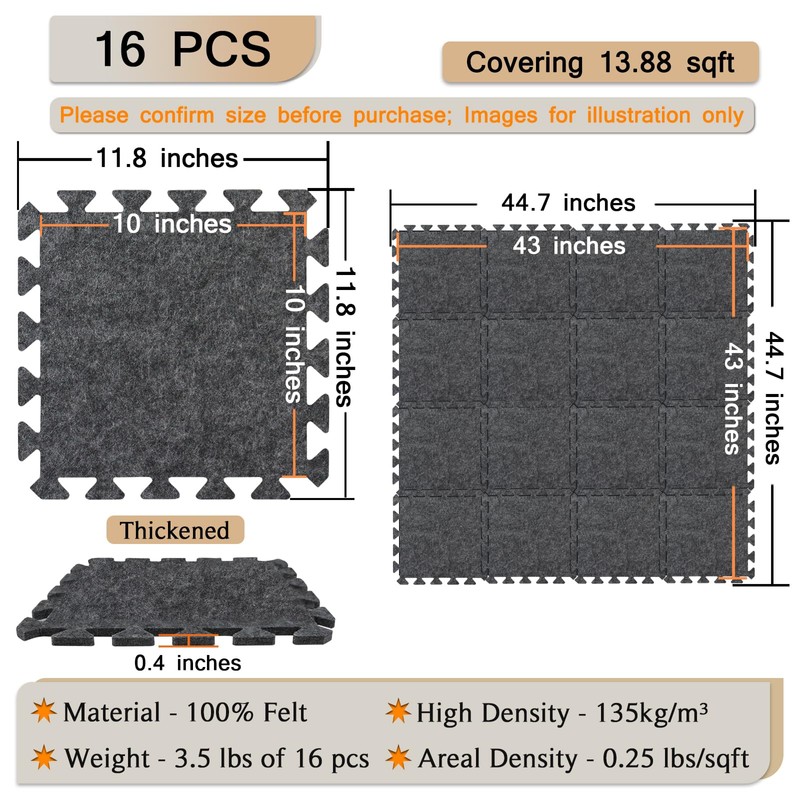 - 【SPECIFICATION】: Dimensions: 11'' x 11'' x 0.4'', pack of 16; Material: 100% polyester fiber felt; Density: 135kg/m3; Areal Density: 0.25 lbs/sqft; Weight: 0.22lbs per panel