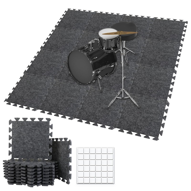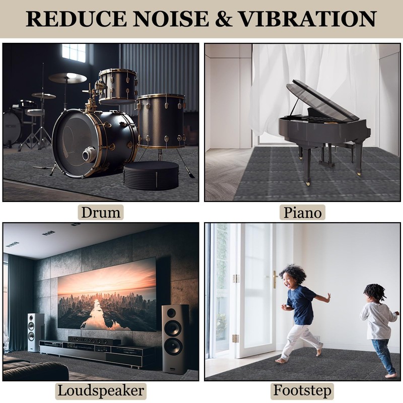 - 【THICKENED, ANTI-COLLISION & VERSATILE USE】: This sound proof floor mat is made up of thickened and dense acoustic material to more effectively enhance your listening environment. It can protect kids from hitting on floors and keep floors from abrasion damage. It's odorless, non-toxic, non-discoloring, dirt resistant, formaldehyde-free, and easy to clean. Great underlayment for drum, piano, loud speakers, music studio, hardwood floor, treadmill, chair, home gym, office, kids' playroom, etc