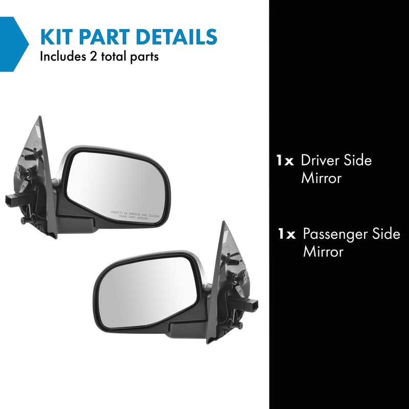 - Kit Includes: (1) Driver Side Mirror; (1) Passenger Side Mirror