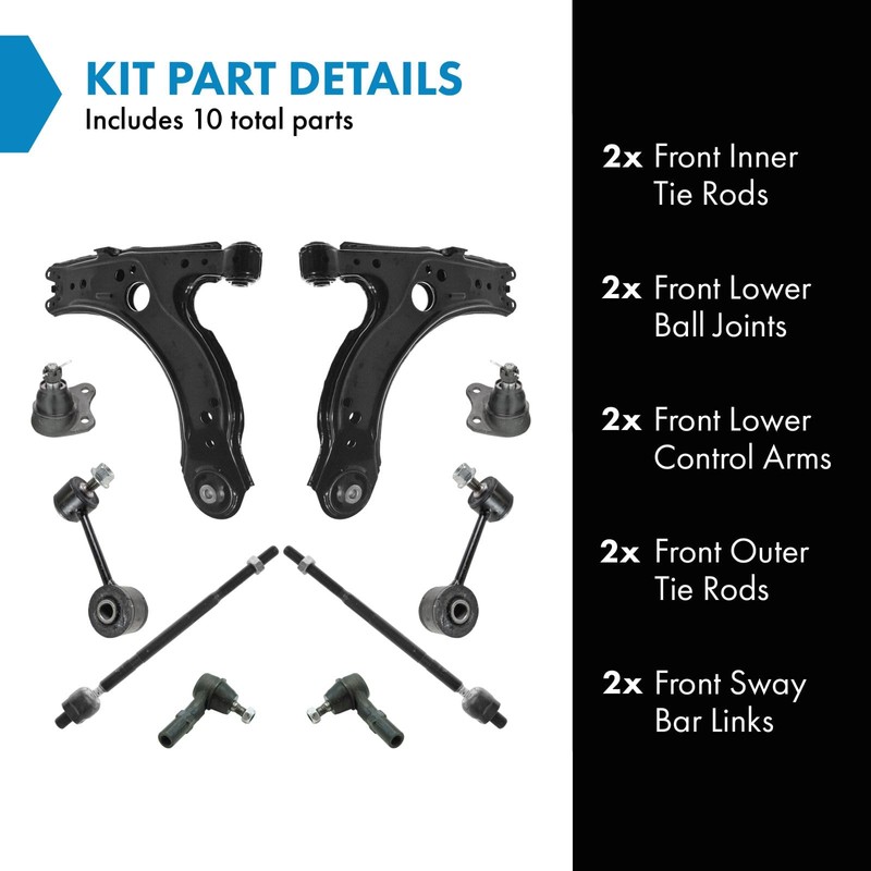 - Kit Includes: (2) Front Sway Bar Links; (2) Front Lower Control Arms; (2) Front Inner Tie Rods; (2) Front Outer Tie Rods; (2) Front Lower Ball Joints