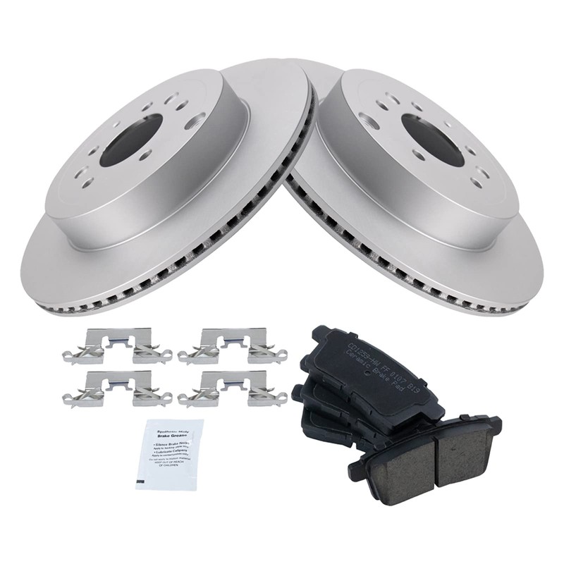 - Kit Includes: (1) Rear Ceramic Brake Pad Set with Contact Point Grease & Hardware; (2) Rear G-Coated Brake Rotors
