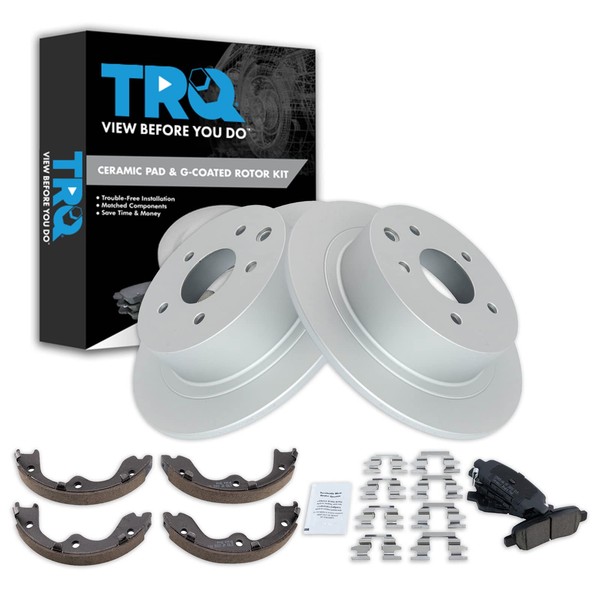 TRQ Rear Brake Pad & Rotor Kit Brake Pads Brake Rotor Parking Brake Shoe Set Ceramic Premium G-Coated Compatible with 2002-2021 Nissan Altima 2004-2018 Maxima