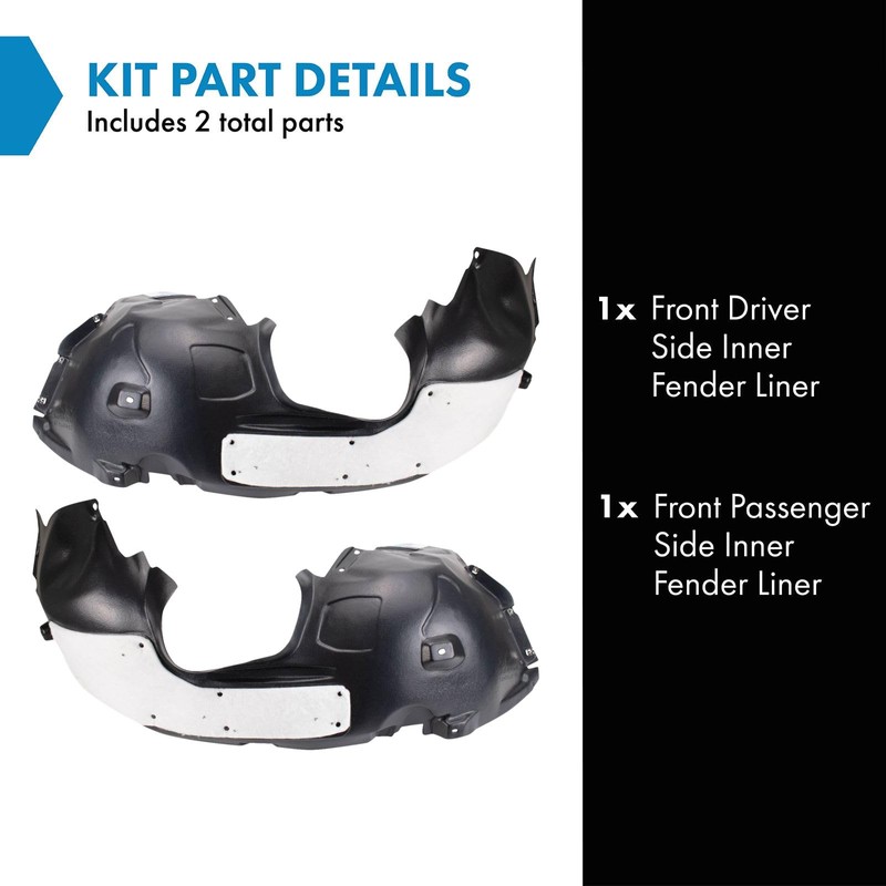 2 Piece Inner Fender Liner SetKit Includes(1) Front Driver Side Inner Fender Liner(1) Front Passenger Side Inner Fender LinerFitmentCompatible with: 2014-18 Ford Transit Connect XLT Front Driver & Passenger SideCompatible with: 2014-18 Ford Transit Connect Titanium Front Driver & Passenger SideProduct AttributesQuantity: 2 PieceReference NumbersFord: DT1Z 16102 C, DT1Z 16103 C, DT1Z16102B, DT1Z16102C, DT1Z16103B, DT1Z16103CPartslink Numbering System: FO1248166, FO1249166