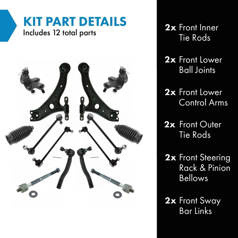 - Kit Includes: (2) Front Lower Ball Joints; (2) Front Lower Control Arms; (2) Front Sway Bar Links; (2) Front Inner Tie Rods; (2) Front Outer Tie Rods; (2) Front Steering Rack & Pinion Bellows